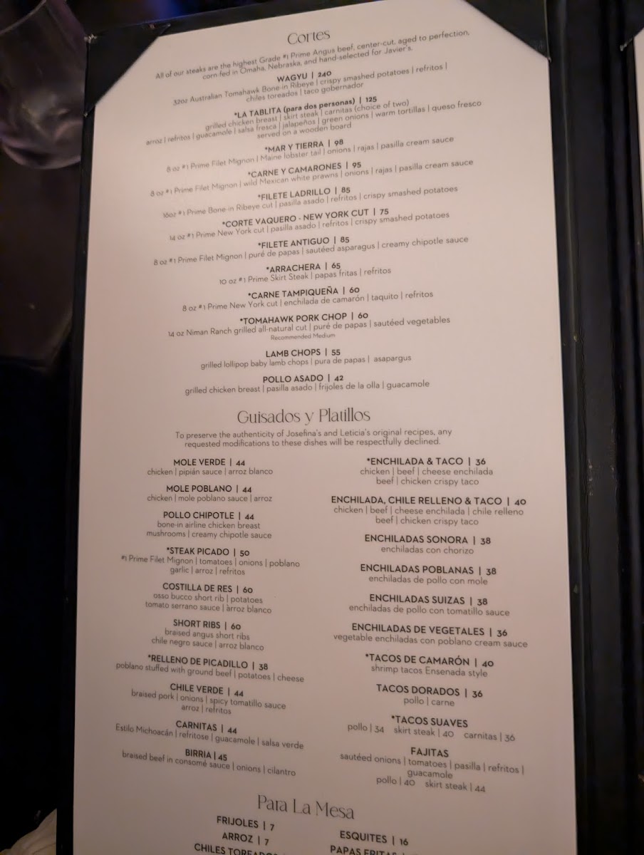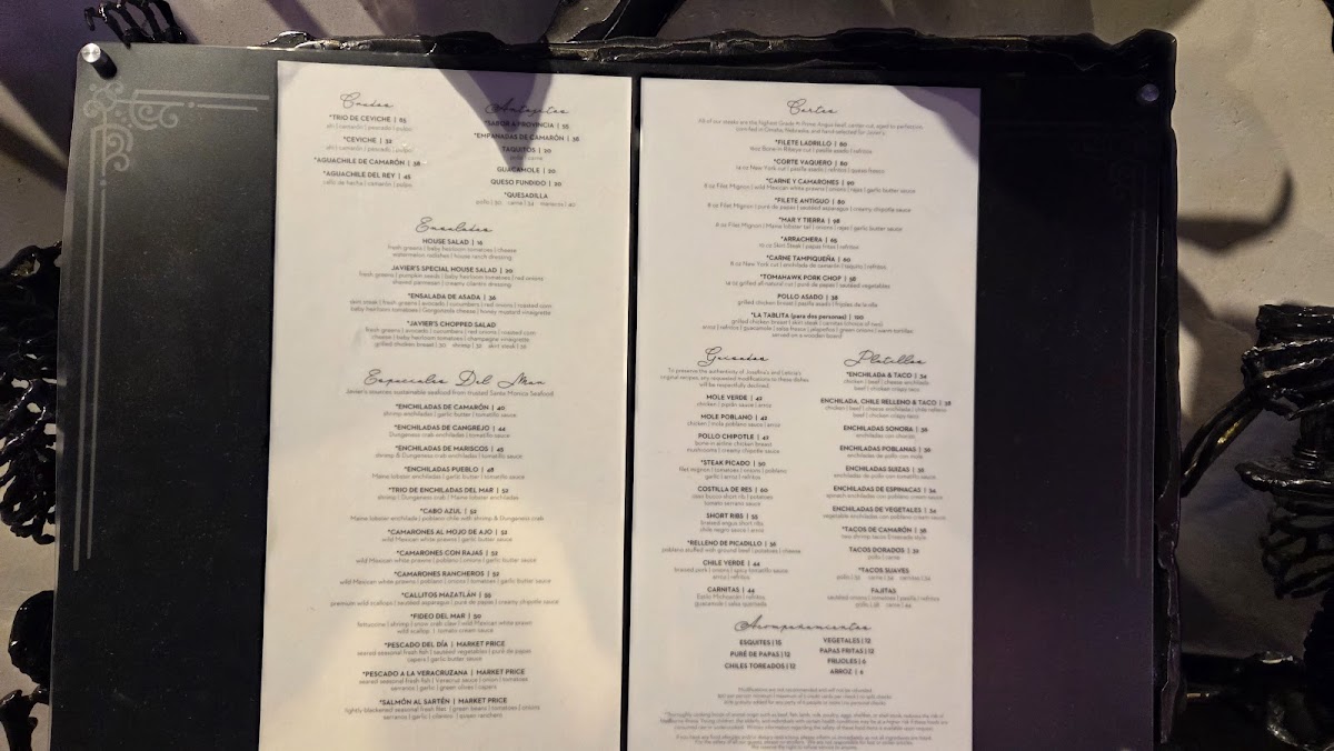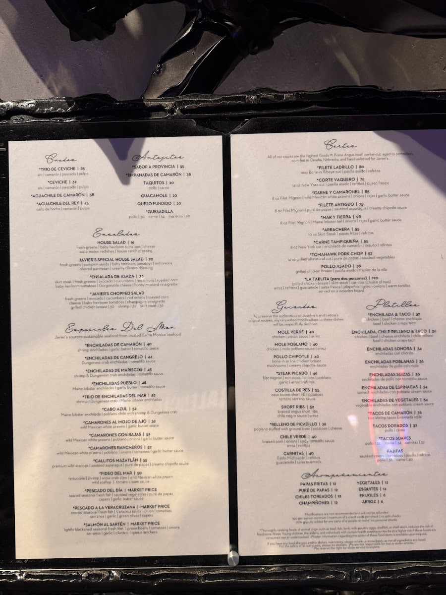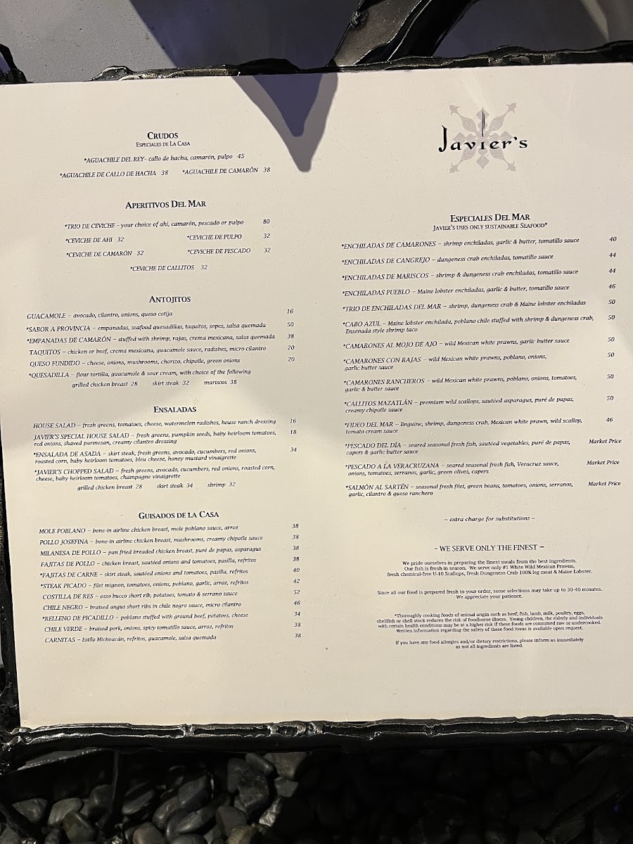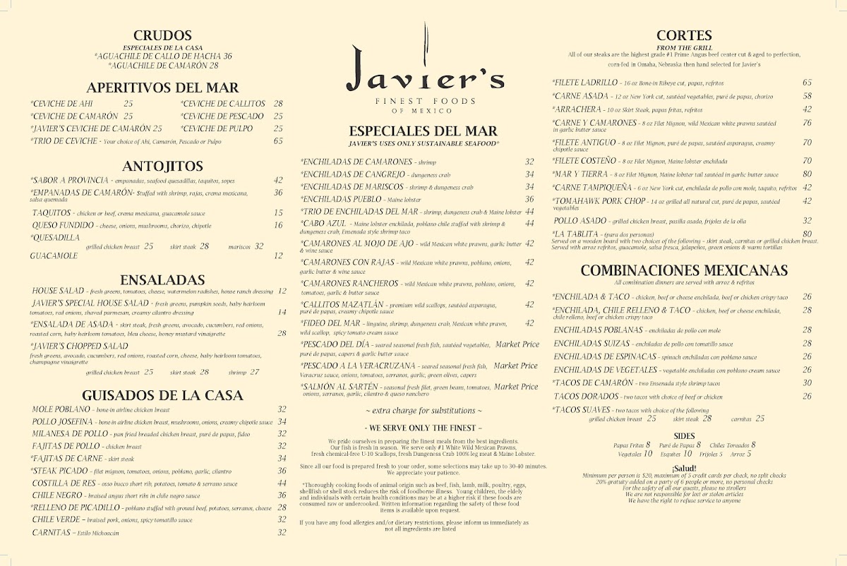 Javier’s menu offers a refined take on classic Mexican cuisine, blending rich, authentic flavors with an upscale atmosphere. The menu features a variety of thoughtfully prepared dishes that range from hearty entrées to lighter, shareable options, making it easy to enjoy a relaxed dinner or a lively night out.